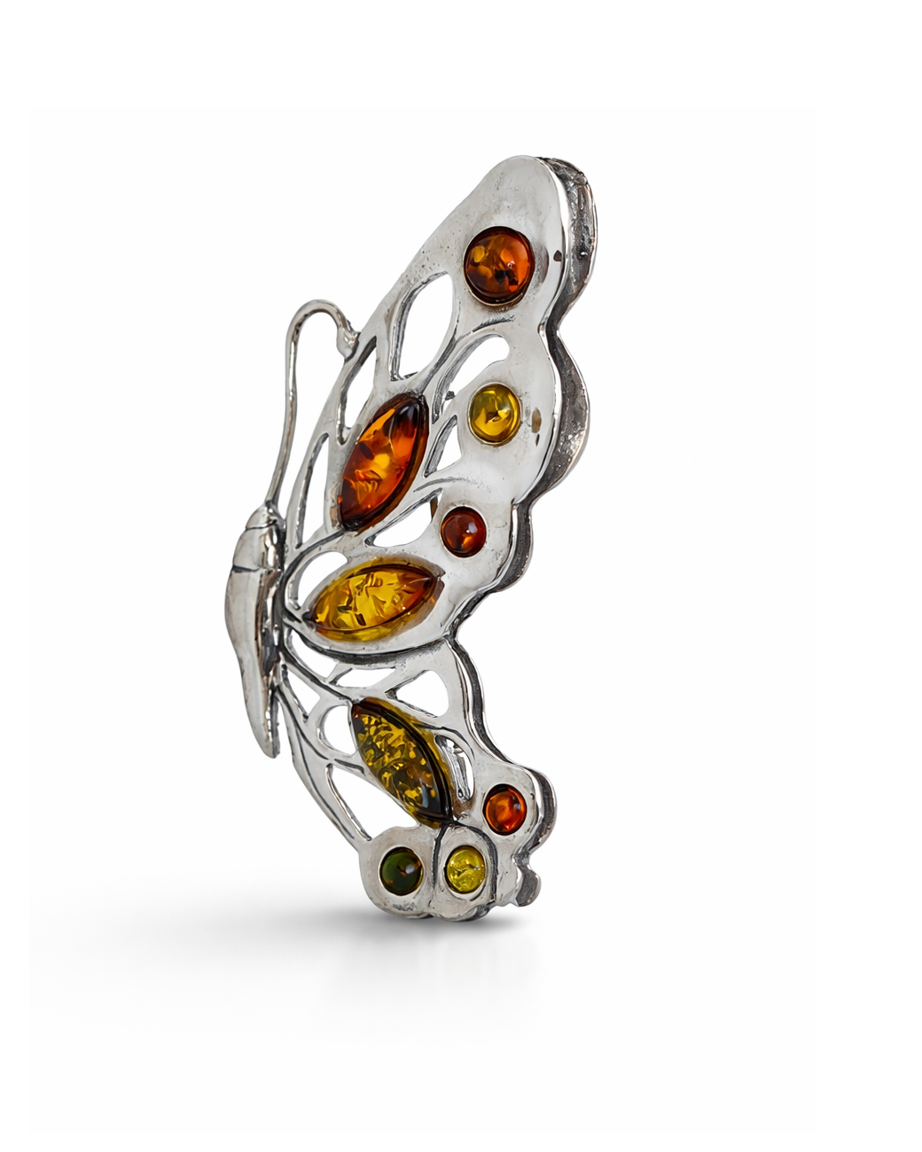 In aceasta minunata brosa de argint, vei descoperi un univers al elegantei si naturii. Forma jumatatii de fluture, cu aripile sale intinse ca intr-un dans, reda gratia si libertatea zborului. Nuantele calde de chihlimbar miere, maro si verde adauga profunzime si farmec acestei creatii.