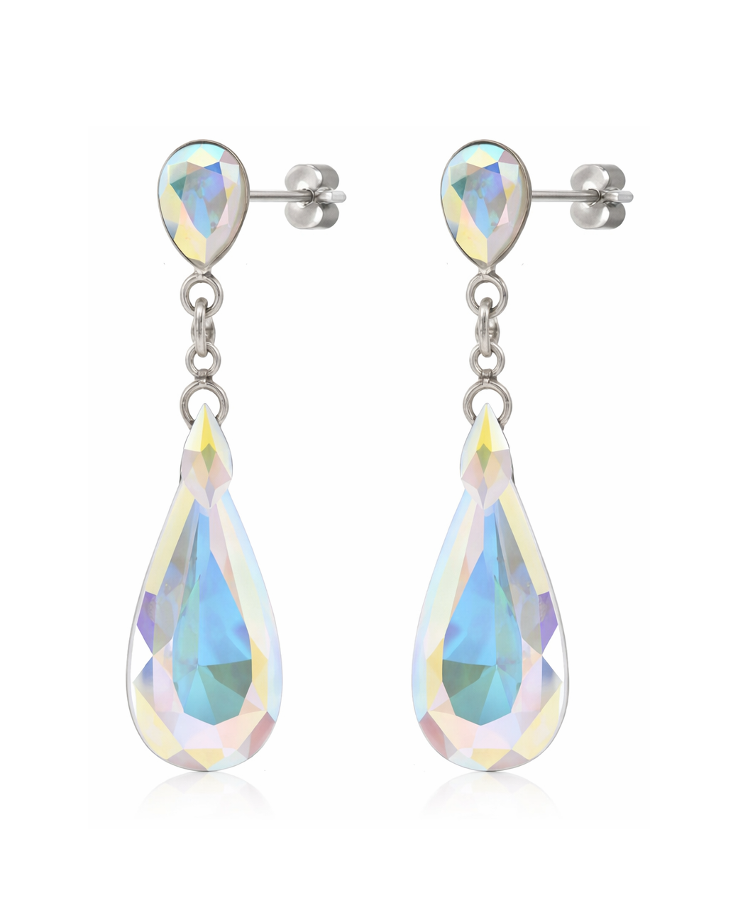 Cerceii sunt realizati cu cristale Swarovski Aurora Borealis, iar sistemul de inchidere este cu surub pe ureche si dopuri din argint 925.