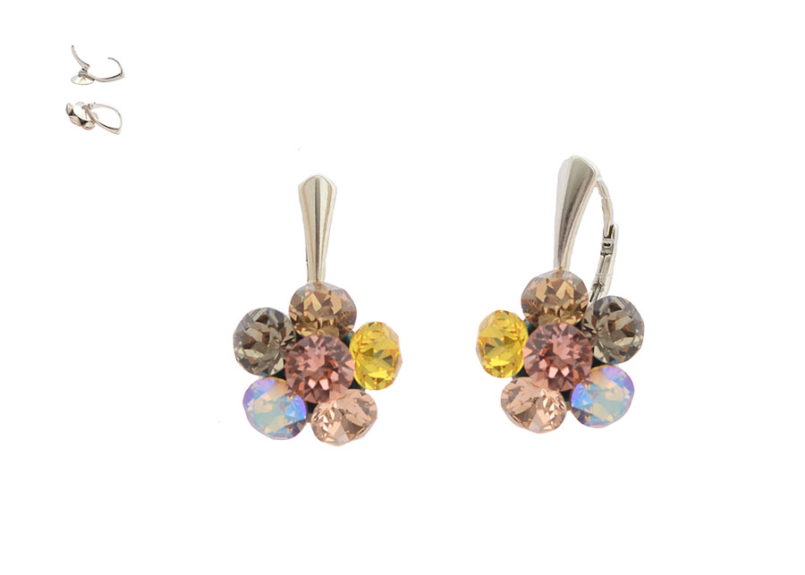 Cercei floare realizati din 6 cristale Swarovski : Rose Peach, Peach, Light Topaz, Golden Shadow, Greige, Topaz Shimmer. Fiecare cristal are dimensiunea de 6 mm, astfel incat diametrul florii este de aprox. 16 mm. O pereche de cercei mare, care acopera urechea, disponibila in 3 variante: pe lobul urechii, tortita leverback scurta(se inchide la spate printr-un simplu click) si tortita leverback lunga (se inchide la spate cu un singur click). In realitate cristale Swarovski sunt mult mai stralucitoare decat in poze, iar nuantele pot sa difere putin.