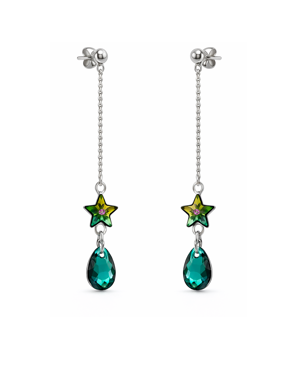 Cerceii sunt realizati cu cristale Swarovski Lacrima Verde Smarald cu dimensiunea de 10 mm si cristale Swarovski Stea-Vitrail Medium cu dimensiunea de 10 mm.