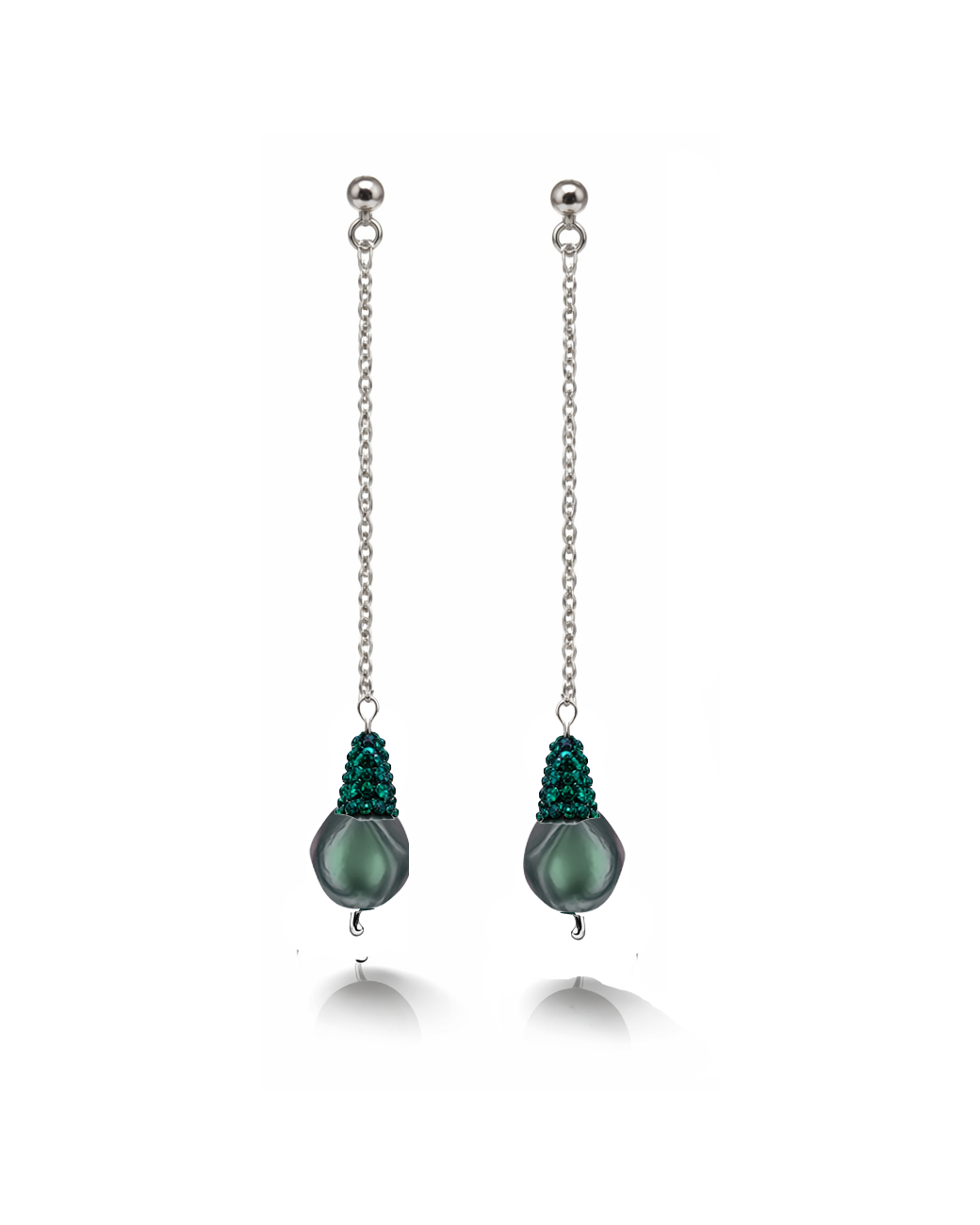 Cerceii sunt realizati cu perle Swarovski gri inchis cu dimensiunea de 8 mm, decorate cu foarte multe cristale Swarovski in culoarea Verde Smarald cu dimensiunea de 1 mm fiecare.