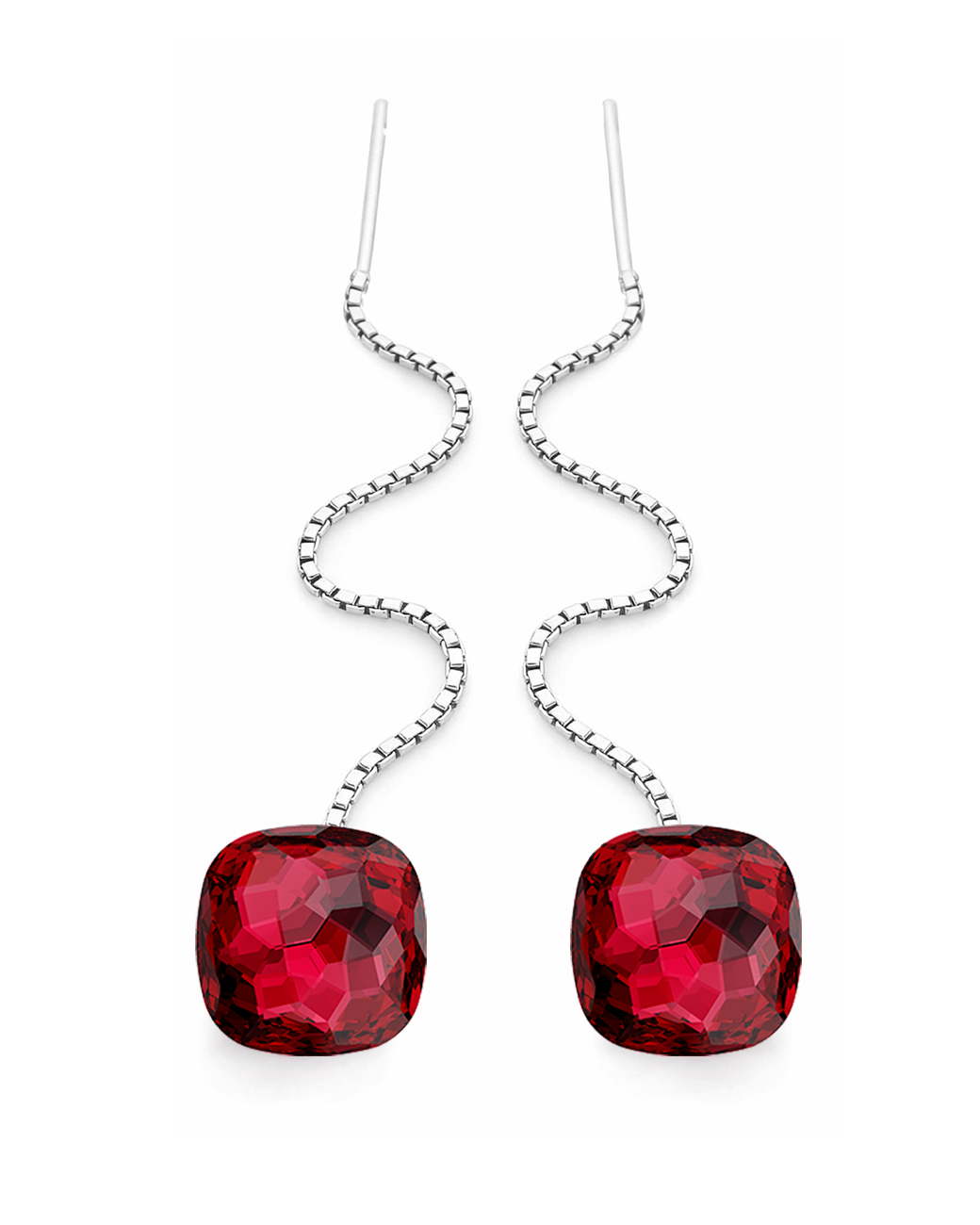Incrustati cu 2 cristale Swarovski de 8 mm de culoarea rosie cu taietura cushion ( in forma de pernuta cu colturile rotunjite) cu 116 fatete, cu aceeasi fatetare pe partea din fata si din spate a cristalului aceasta pereche de cercei subliniaza contururile seducatoare ale gatului, accentueaza trasaturile fetei si completeaza toate tipurile de coafuri.