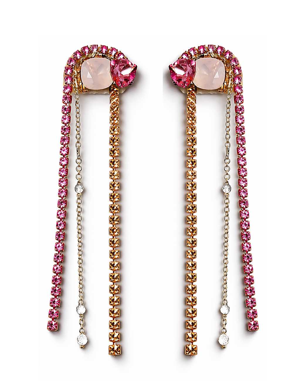 Cristale Swarovski în partea superioară, lanțișor argintiu și lanțișor cu strasuri în nuanțe roz si silk