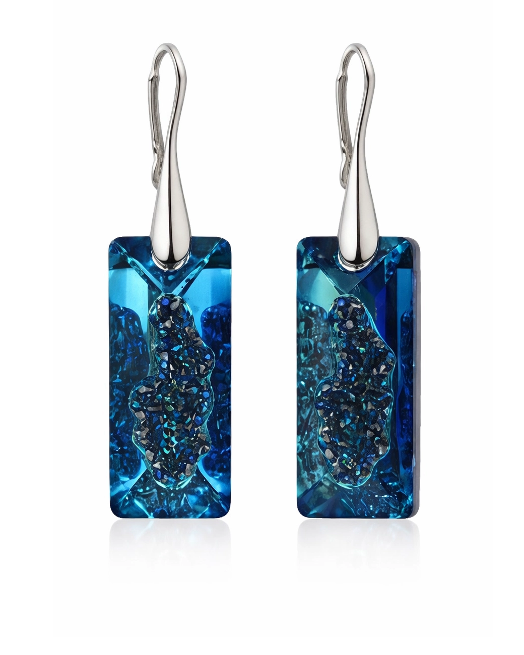 Cerceii sunt realizati din cristale Swarovski Bermuda Blue- cu dimensiunea de 26mm lungime si 11 mm latime, taiate cu precizie impecabila,  care se schimba la nesfarsit in diferite reflexii de lumina si culoare si tortite leverback care se inchid la spate cu un simplu “click” pentru o fixare sigura, fara grija de a-ti pierde cerceii.