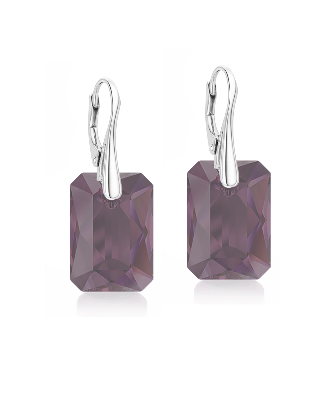 Adauga o stralucire subtila tinutei tale cu Cercei tortite leverback Emerald Cut Swarovski Crystal Amethyst 18 mm creata in atelierul Cristalia®.