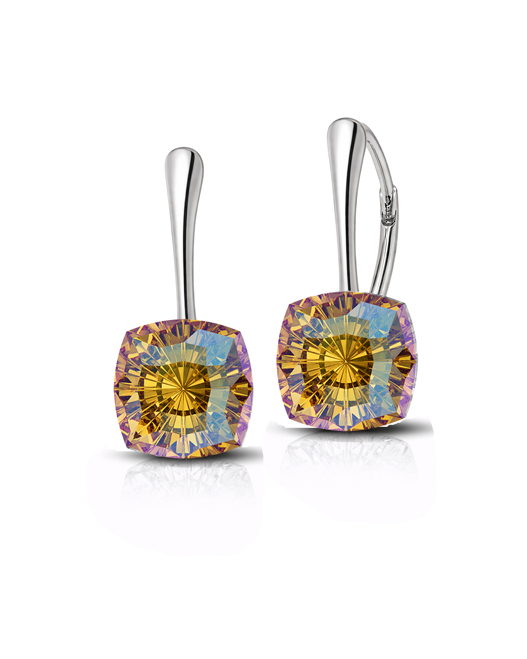 Cerceii tortite leverback Mystic Square Topaz Shimmer 10 mm sunt realizati cu 2 cristale Swarovski maro-portocalii de 10 mm fiecare si doua tortite cu inchidere la spate din argint 925. Dimensiunea totala a cercelului este de 20 mm, iar lungimea tortitei cuprinsa intre partea metalica din argint si cristalul Swarovski este de 11 mm.