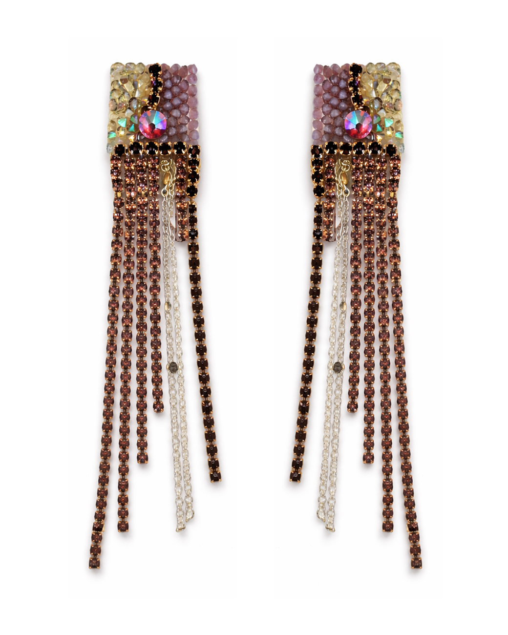 Cristale Swarovski în partea superioară, lanțișor argintiu și lanțișor cu strasuri în nuanțe mov