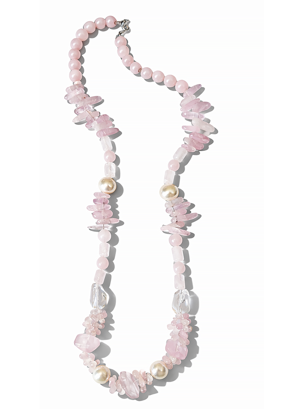 Designul acestui colier este o expresie a rafinamentului si frumusetii naturale a pietrelor semipretioase. Realizat dintr-o combinatie fascinanata de pietre, inclusiv cuart roz, jad roz, sidef si cristal de stânca. Cuartul roz adauga o nota de delicatete si iubire, jadul roz confera echilibru si armonie, Sideful ofera stralucire si eleganta, iar Cristalul de Stanca aduce claritate si puritate. Acest colier este mai mult decat o simpla bijuterie – este o expresie a frumusetii naturale si a simbolurilor profunde pe care aceste pietre le poarta , iar alegerea sa va aduce un plus de farmec si semnificatie oricarei tinute.