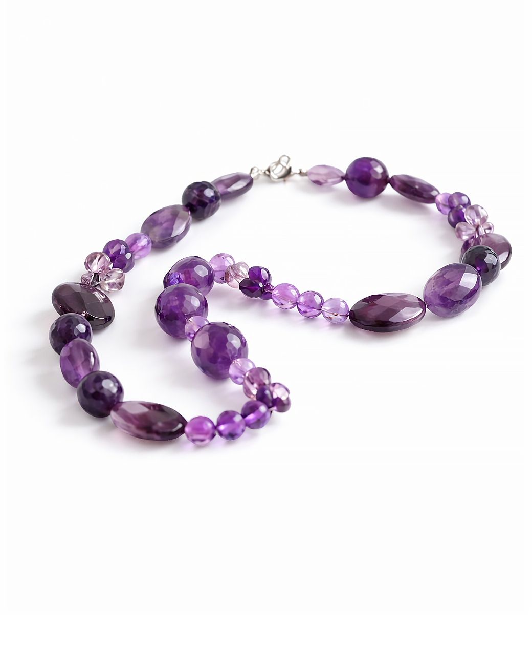 Pietrele de ametist, cu nuante lor viu colorate de purpuriu, adauga un farmec aparte acestui colier si atrag privirile cu frumusetea lor.
