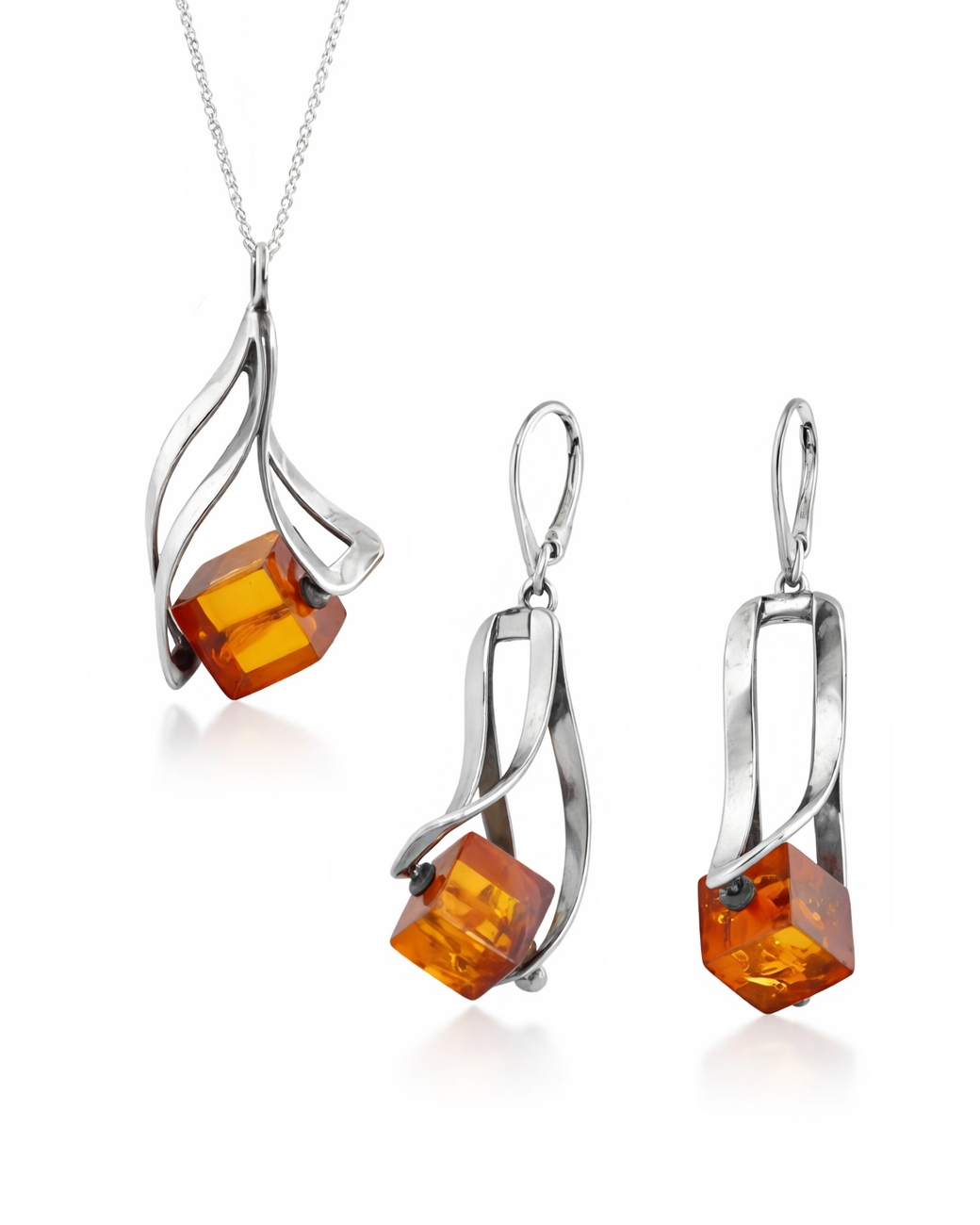 Te invitam intr-o incursiune in universul spectaculos al elegantei cu acest set uluitor de bijuterii argint in format 3D. Pandantivul si cerceii mari, regali si stralucitori, te transporta intr-o lume a extravagantei si rafinamentului. Chihlimbarul miere, pretios si luminescent, sculptat in forme cubice cu o taietura 3D, adauga profunzime si mister fiecarei piese.