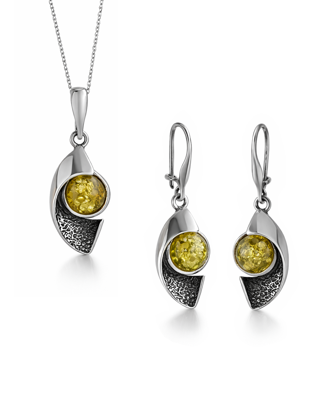 Setul bijuterii din argint imbina cu eleganta si rafinament chihlimbarul verde, oferind un model clasic ce emana subtilitate si stil. Fiecare piesa este meticulos lucrata pentru a aduce in prim-plan farmecul naturii si autenticitatea argintului. Alege aceste bijuterii pentru a adauga un plus de eleganta si strslucire discreta fiecărei tinute.