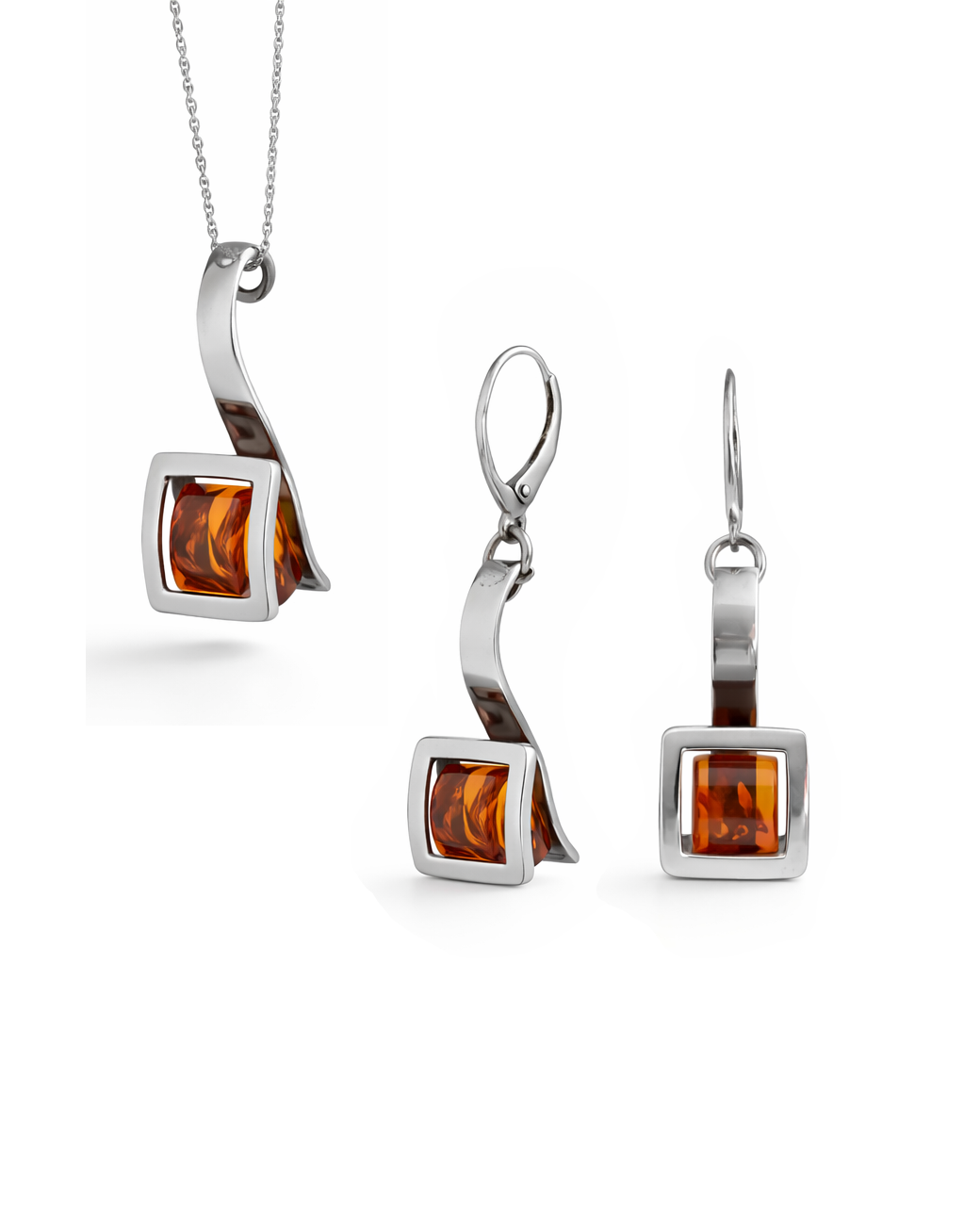 Descopera un set impresionant de bijuterii argint in format 3D, compus dintr-un pandantiv si cercei eleganti, cu sistem de prindere cu tortita tip leverback pentru o fixare sigura. Fiecare piesa este minutios lucrata si decorata cu pietre de chihlimbar in forma de cilindru, cu un design taiat in 3D, conferindu-le adancime si un aspect unic. Culoarea chihlimbarului aduce aminte de nuanta calduroasa a mierii, emanand o aura de eleganta si rafinament. Acest set de bijuterii se remarca prin designul modern si extravagant, fiind alegerea perfecta pentru cei care apreciaza originalitatea si eleganta in accesorizare.